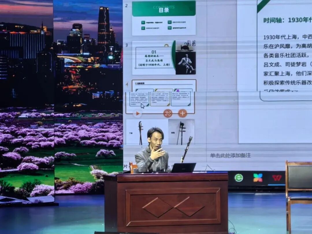 23日上午,余乐夫老师在名家讲座上以《“亦土亦洋”的当代高胡艺术》为题,与当地学员分享了他对高胡艺术的心得体会。他以高胡与广东音乐艺术百年发展为脉络,论述其融合传统音乐底蕴与西方音乐元素的特点、创新表现及艺术价值,并作了多首作品的现场演奏示范。